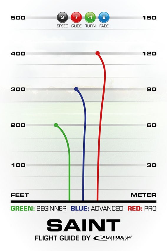 The Saint boasts impressive flight ratings, with a speed of 9, glide of 7, turn of -1, and fade of 2, illustrating its ability to achieve significant distance with notable glide. This disc is especially recommended for flights up to 350 feet, showcasing a glide rating that is unmatched by many, allowing it to stay aloft longer and traverse greater distances with ease. Its slight turn and moderate fade ensure that it can navigate various course conditions while maintaining a predictable flight path.